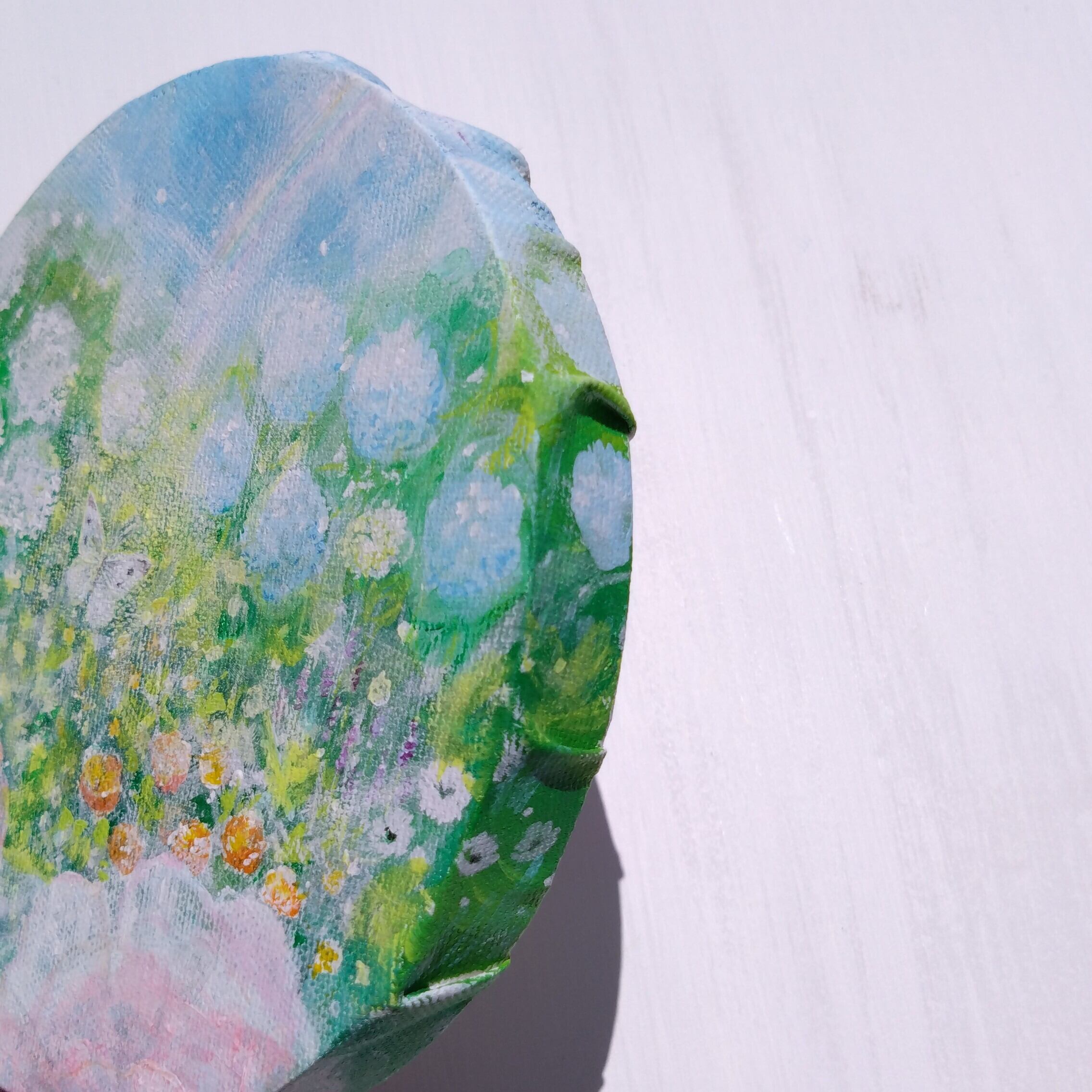 直径15cmの丸いキャンバスに雨上がりの花々と蝶を描きました